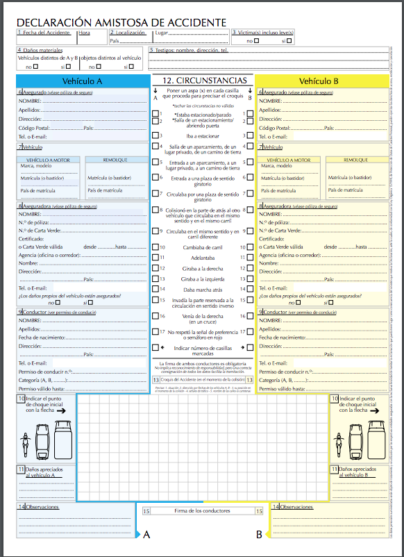 En el caso de que todo esté totalmente claro tras el accidente, y una vez buscado un lugar tranquilo y seguro, procederemos a cumplimentarlo. Como todos sabéis, se trata de un documento con dos hojas (la segunda es un papel calco) para que cada implicado se pueda llevar una copia idéntica de la declaración firmada y poder presentarlo a su correspondiente aseguradora (y para los que no lo conozcan todavía, aquí os dejo uno para que podáis descargarlo). Por lo tanto una vez separadas las hojas ya no se puede modificar nada pues las copias ya no serían iguales y se puede declarar nulo.